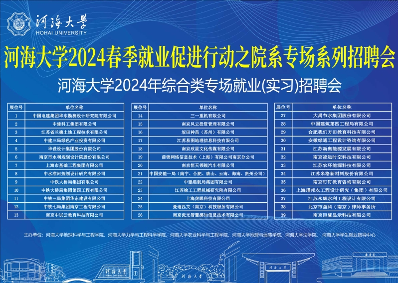 本次招聘会通过前期调研和需求分析,精心策划,广泛宣传,充分挖掘用人单位资源,共邀请到中国电建集团华东勘测设计研究院有限公司、中建科工集团有限公司、江苏省兰德土地工程技术有限公司、中建三局绿色产业投资有限公司、上海基础工程有限公司、华设设计集团股份有限公司、南京派光智慧信息有限公司、南京市水利规划设计院股份有限公司等共计39家用人单位,提供700余个就业(实习)岗位,涵盖建筑业、金融业、制造业、互联网等多个行业。