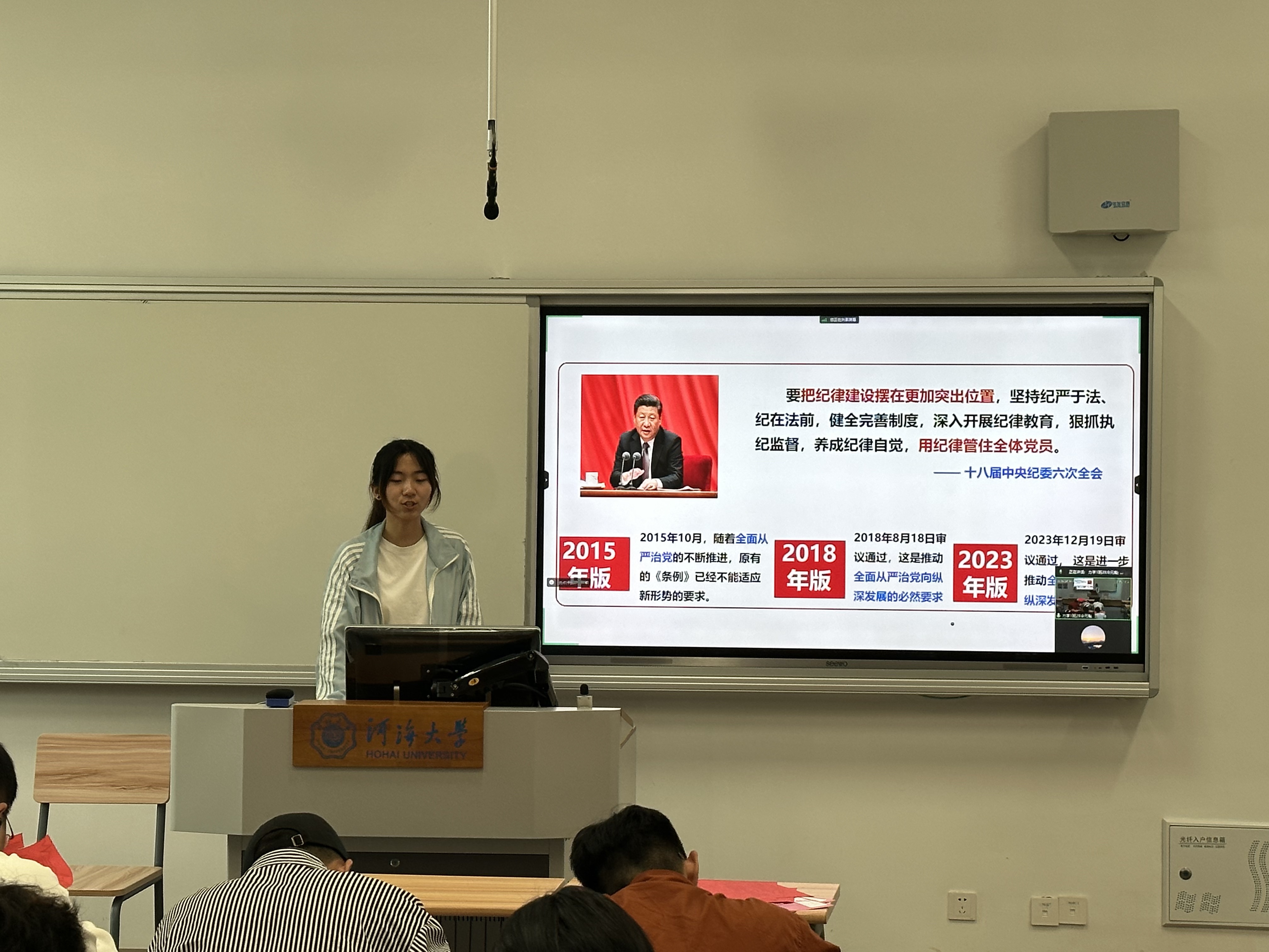 首先,由2022级工程力学专业本科生党员宋孟哲同志领学党的纪律的功能、中国共产党党纪建设百年历程以及学习贯彻《中国共产党纪律处分条例》三个方面的内容。号召各位党员同志要把学习贯彻《中国共产党纪律处分条例》作为重要政治任务,以严明的纪律推进党的自我革命,不断提升党员干部的政治素养和拒腐防变能力。