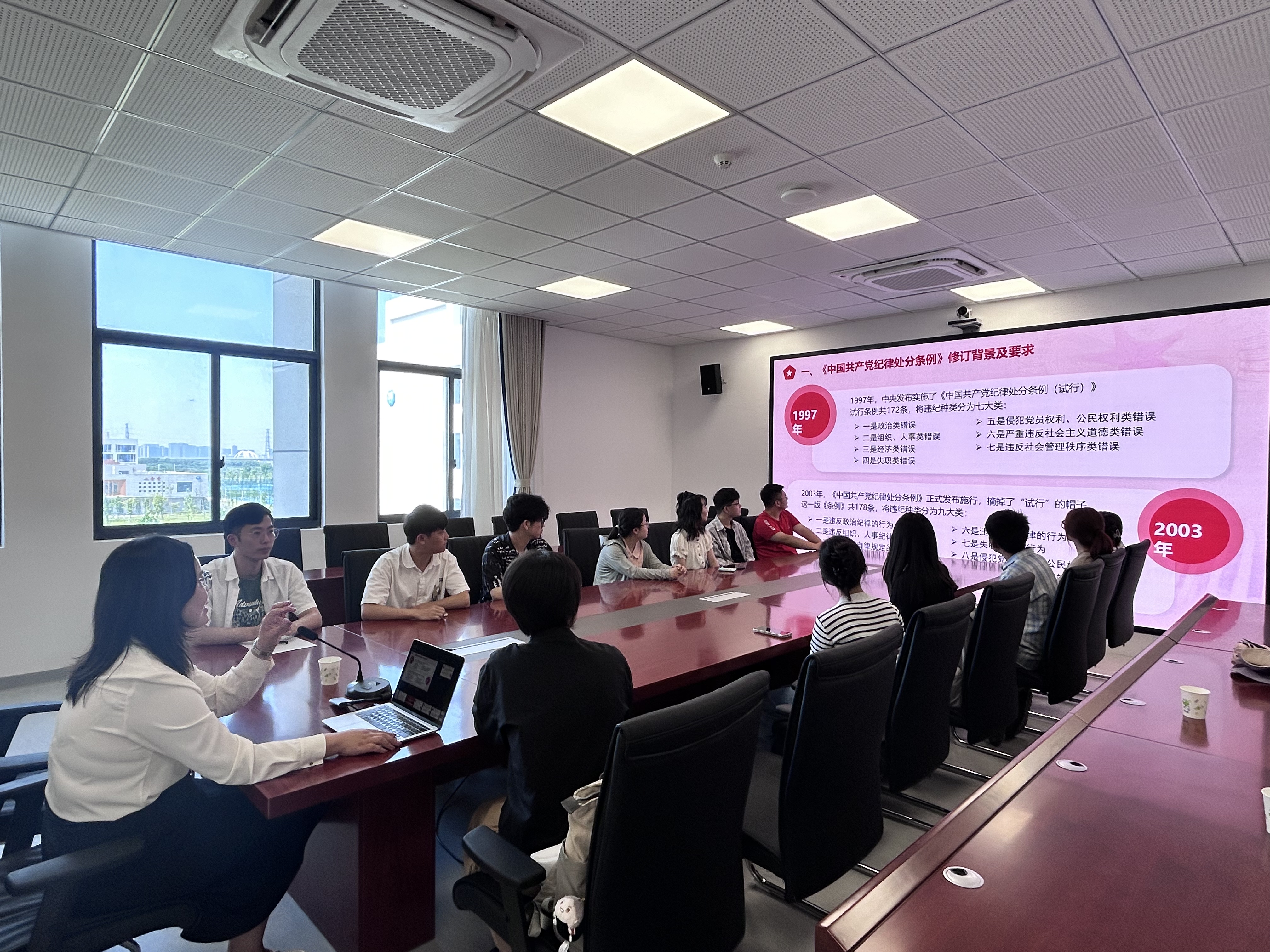 5月23日,常州校区47号楼员工社区功能型党支部联合外语院功能型党支部在56号楼401会议室开展党纪学习教育活动。功能型党支部第一书记王璐进行了《中国共产党纪律处分条例》(以下简称《条例》)解读,来自bw必威西汉姆联官网、外语院、水文院的20余名党员骨干参会,会议由功能型党支部书记李锦主持。