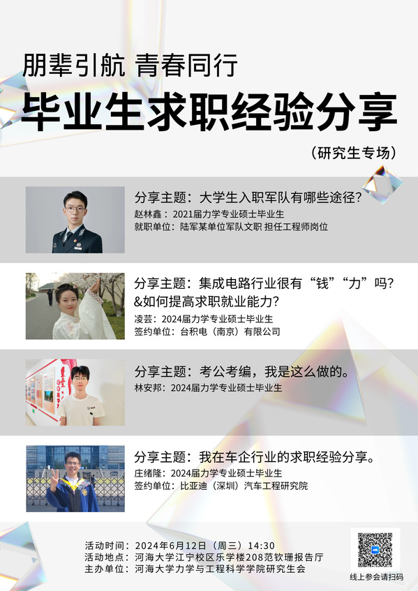 青春万象,勇往“职”前。为帮助学院在校生更好地了解就业市场、掌握求职技巧、规划职业发展路径,学院于6月12日举办了“朋辈引航·青春同行”毕业求职经验分享会,邀请了学院2021届硕士毕业生赵林鑫以及2024届硕士毕业生凌芸、林安邦、庄绪隆4位嘉宾与同学们面对面开展经验交流。200余名研究生与本科生参与了本次活动,分享会由研究生辅导员白灿老师主持。