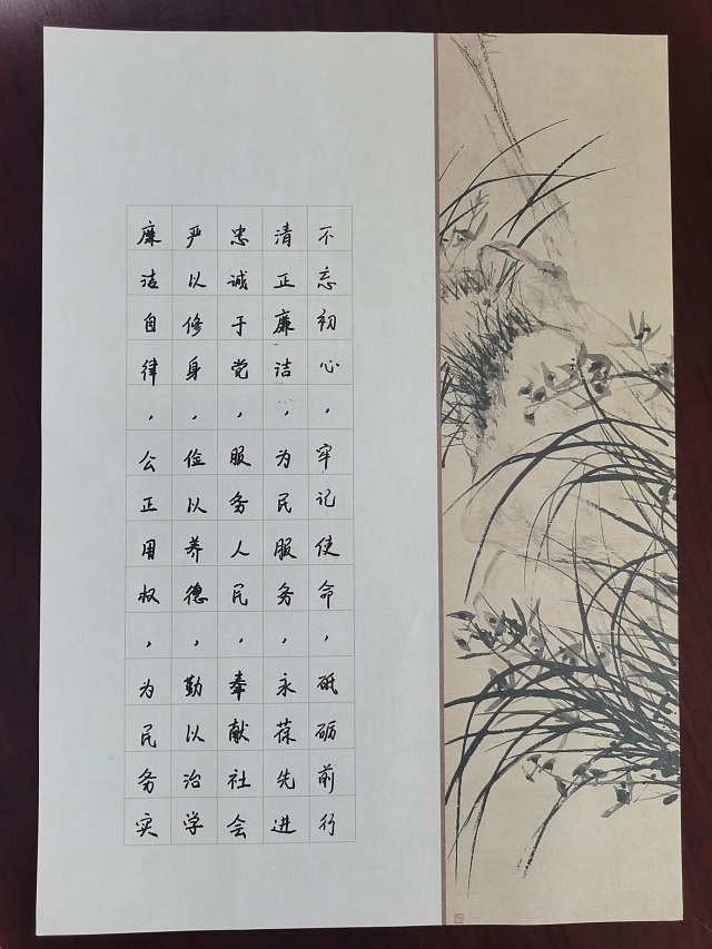 活动现场,党员们手握笔杆,挥毫泼墨,一笔一划书党纪,一纸一墨颂廉洁。他们神情专注,一笔一划地书写着党规党纪的重要内容,在翰墨丹青中书写对纪律规矩的认同与敬畏。“廉洁自律,党性长存”、“不忘初心,牢记使命”等一句句铮铮誓言在纸上呈现,不仅是书法艺术的展示,更是党员们内心坚定信念的表达。