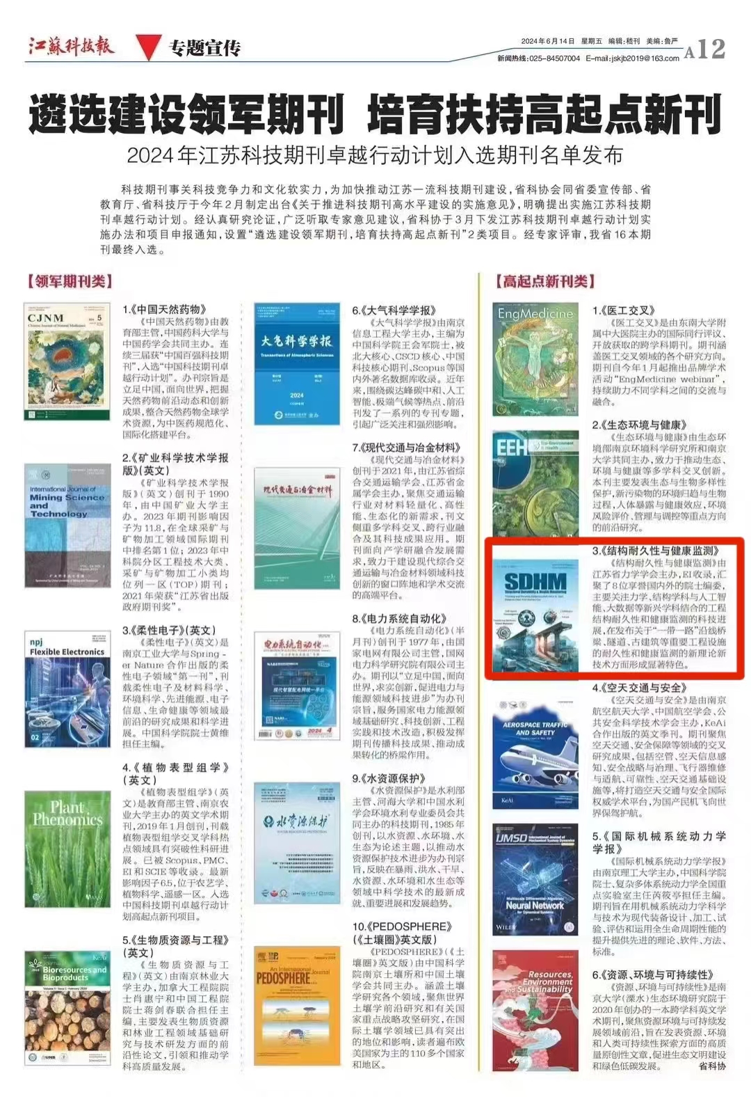 bw必威西汉姆联官网动力学与控制研究所党支部汇聚了在国际上具有影响力一批优秀的结构动力测试、诊断、分析、评估等方面的专家学者。该研究所党支部教师为国际期刊Structural Durability & Health Monitoring(《结构耐久性与健康监测》,ISSN:1930-2983(print); ISSN:1930-2991(online),简称SDHM)建设提供核心支撑,研究所所长兼党支部书记曹茂森担任主编。近日,江苏省科学技术协会公布了2024年江苏科技期刊卓越行动计划入选项目。SDHM入选首批江苏科技期刊卓越行动计划高起点新刊,是该刊发展史上的一个里程碑。