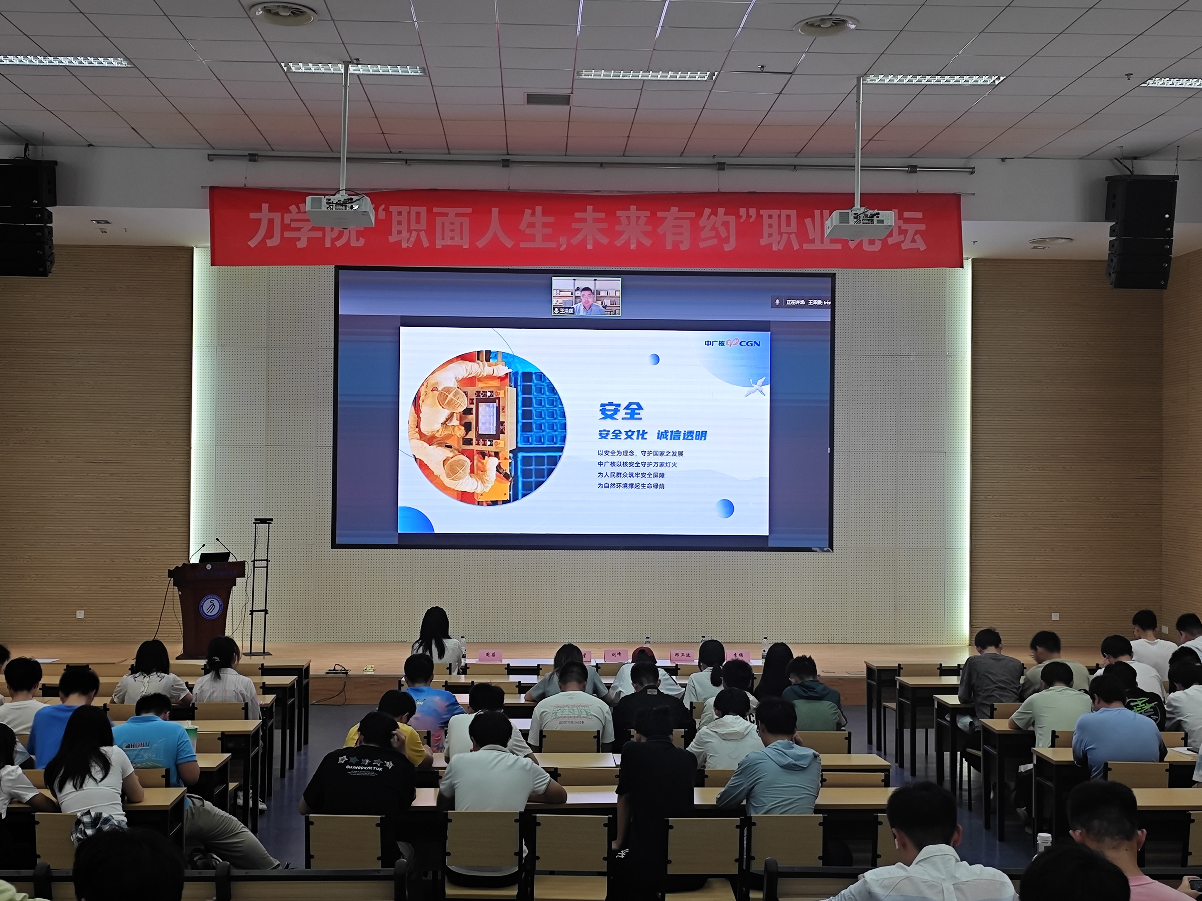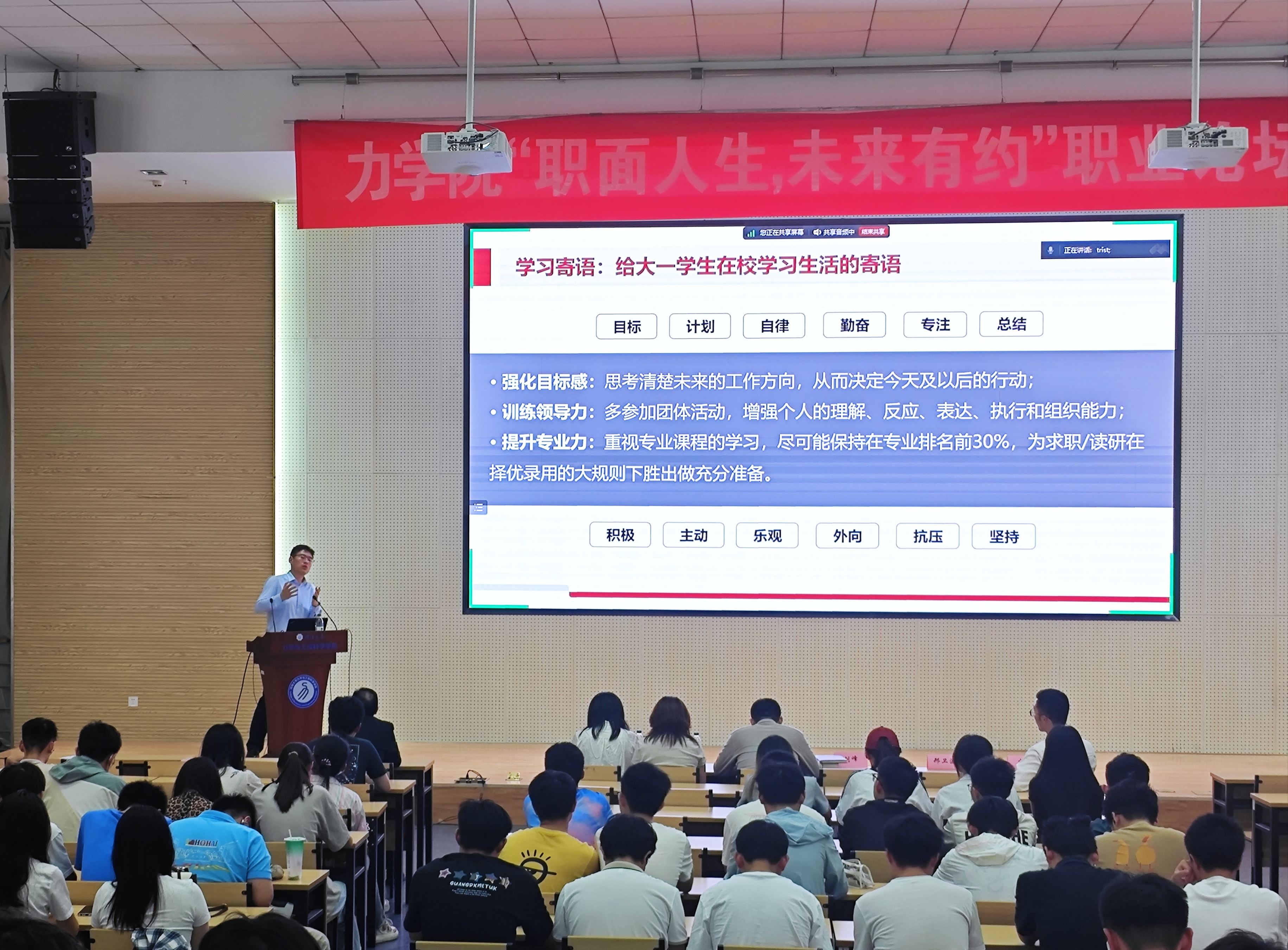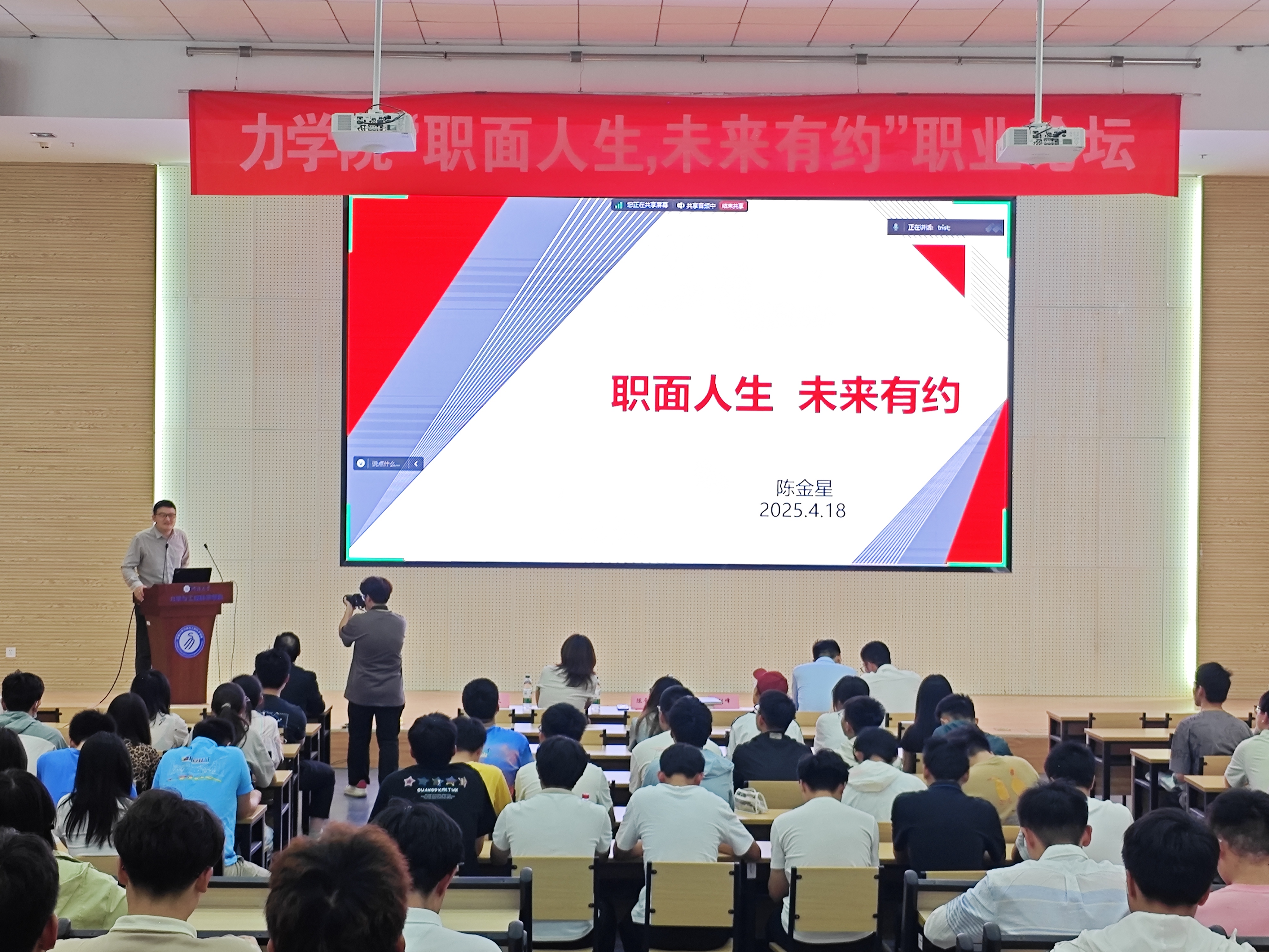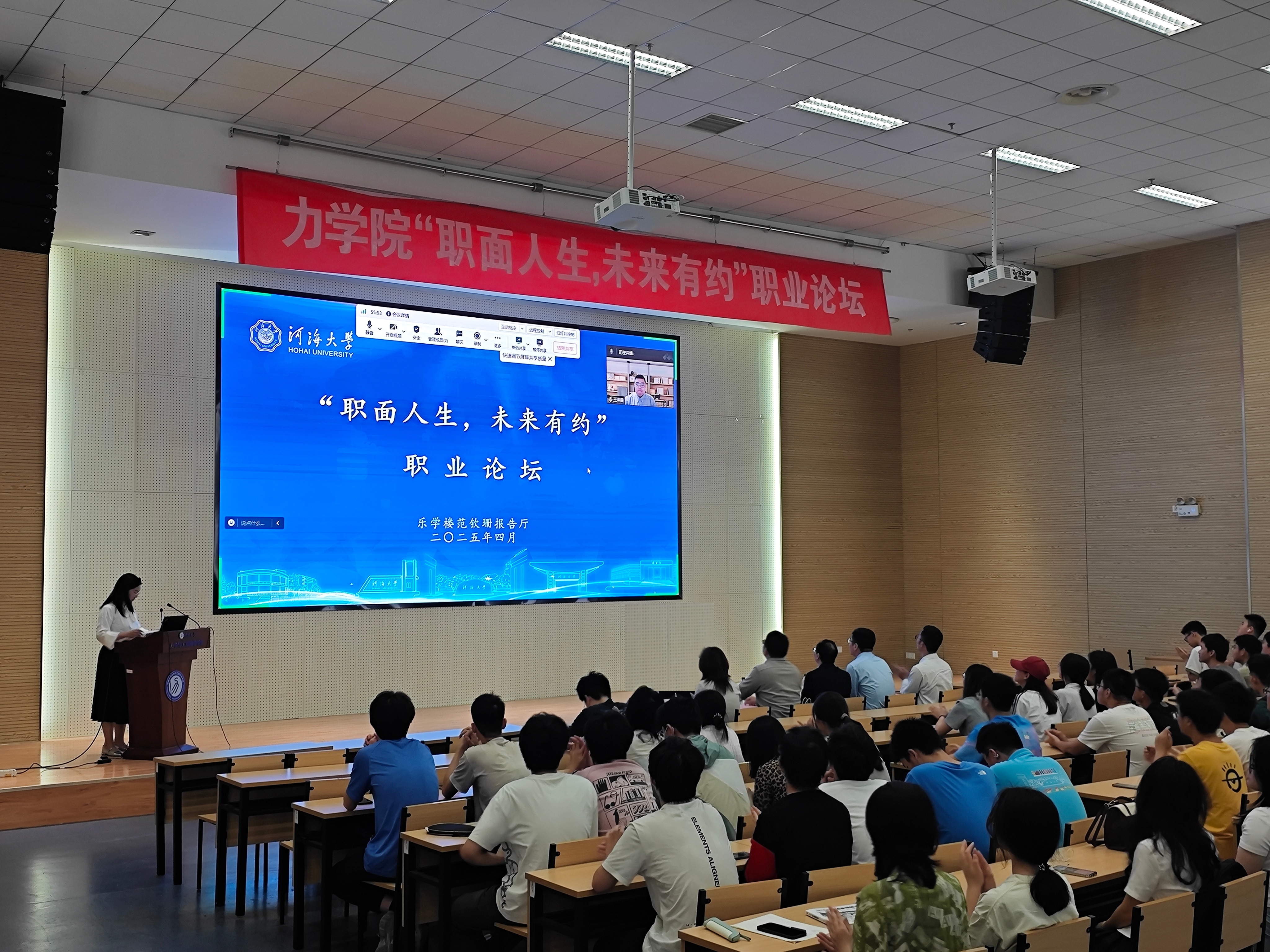2016届应用物理学员工陈金星回顾了在校学习和步入职场后不断学习成长,增强职业能力的经历,强调了持续学习力和适应变化力在职场中的关键作用。建华控股苏南区域人力资源部刑卫波总经理,剖析当前毕业生就业前景,通过生动案例,希望同学们要提升综合竞争力,为应对未来复杂多变的职场环境做好准备。2022届工程力学员工王泽霖讲述了他在校求学经历以及毕业后的求职过程,鼓励同学们用求真的态度、广阔的胸襟、踏实的作风去应对随时可能出现的变化。