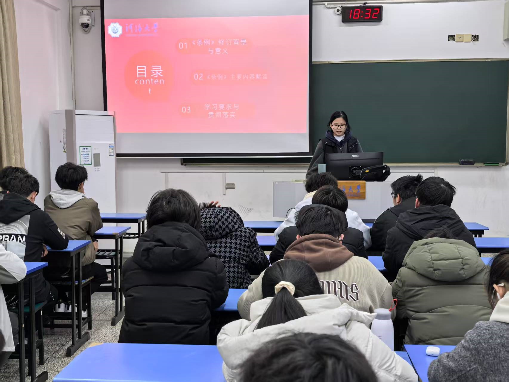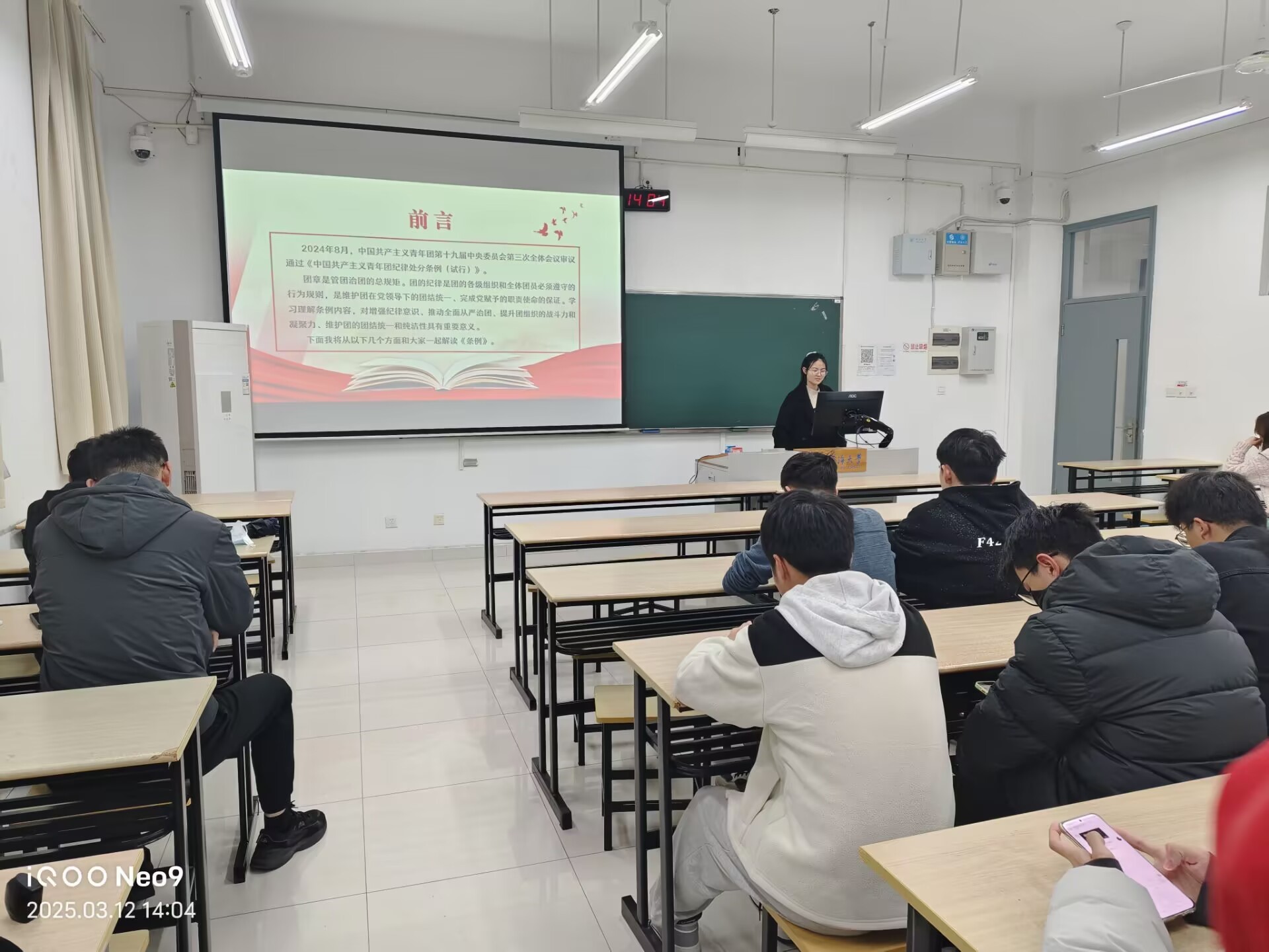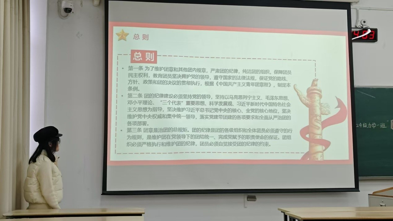 2024级力学1班团支部书记赵雨涵同学领学《处分条例》,主讲《学团纪条例,做守规团员》主题团课,进一步强化团支部团员纪律意识。班导师从团员发展角度,耐心解答同学们在学习和生活中遇到的困惑,并从专业学习、个人发展等方面提出了宝贵建议,鼓励大家勇于挑战自我,合理规划老员工活。