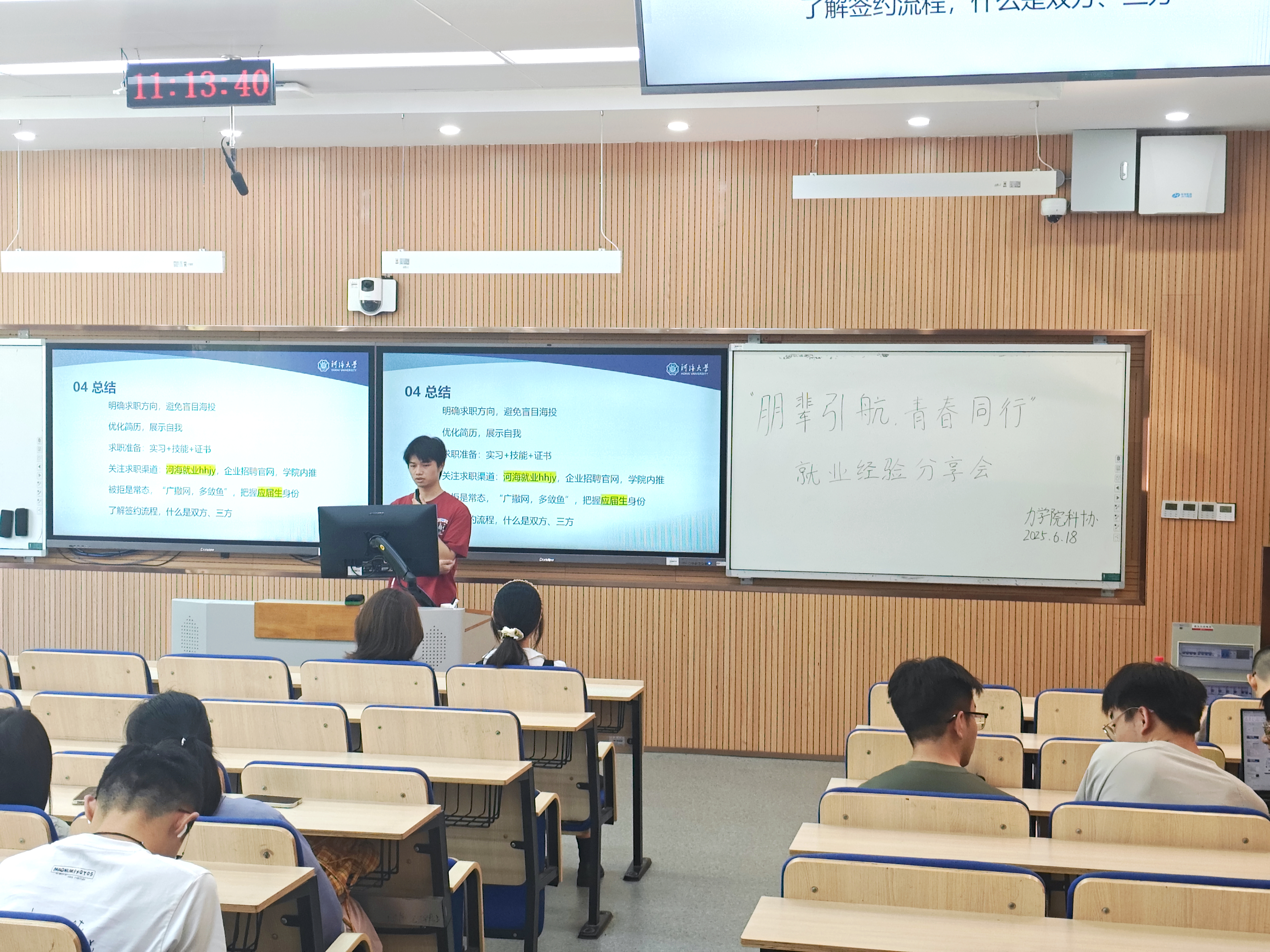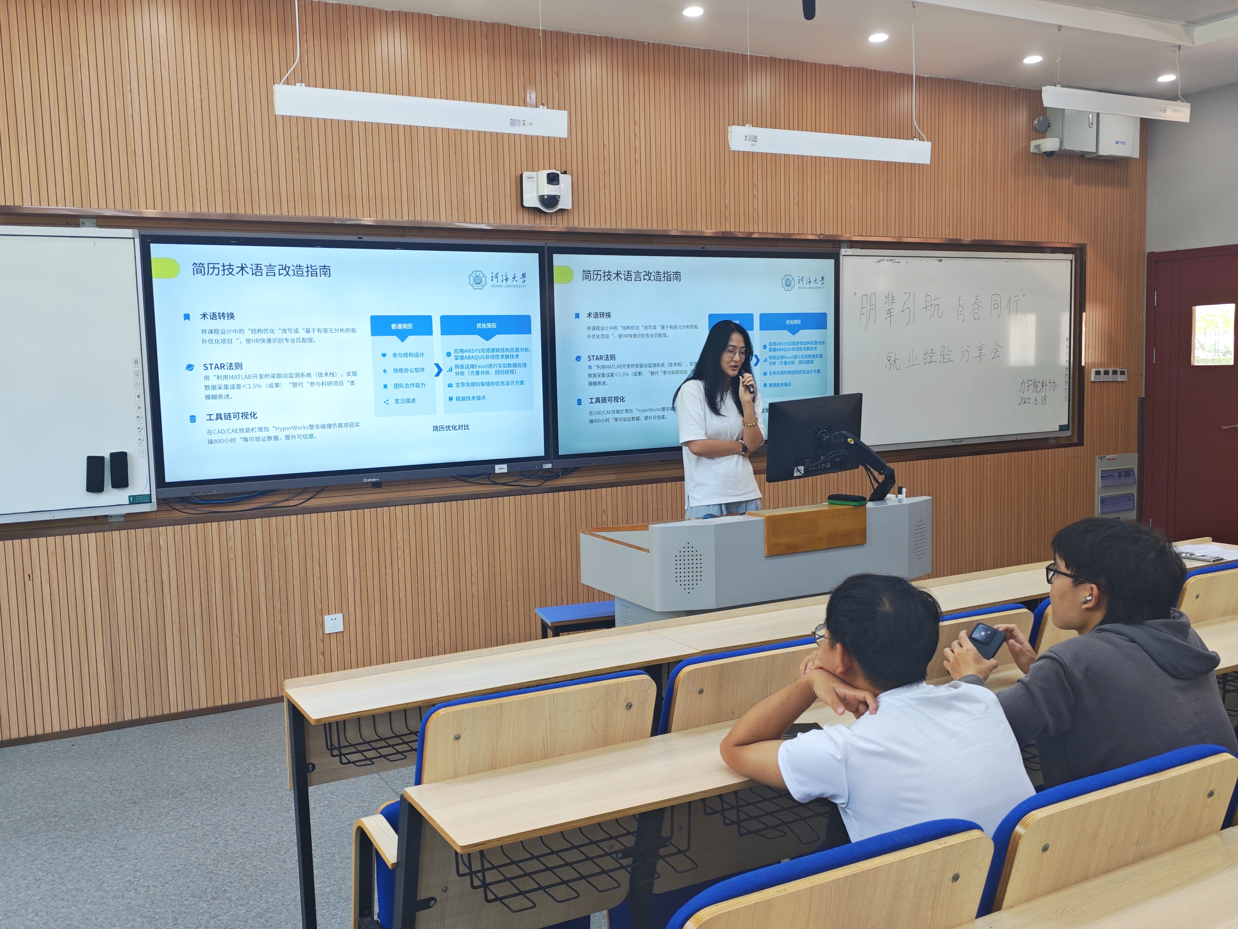 范思圆同学结合自身新能源行业的求职经历,向大家介绍了力学专业不同的就业方向,分享了从校园到职场的转换心得,并向员工工作经历比较丰富的同学提出了求职建议。