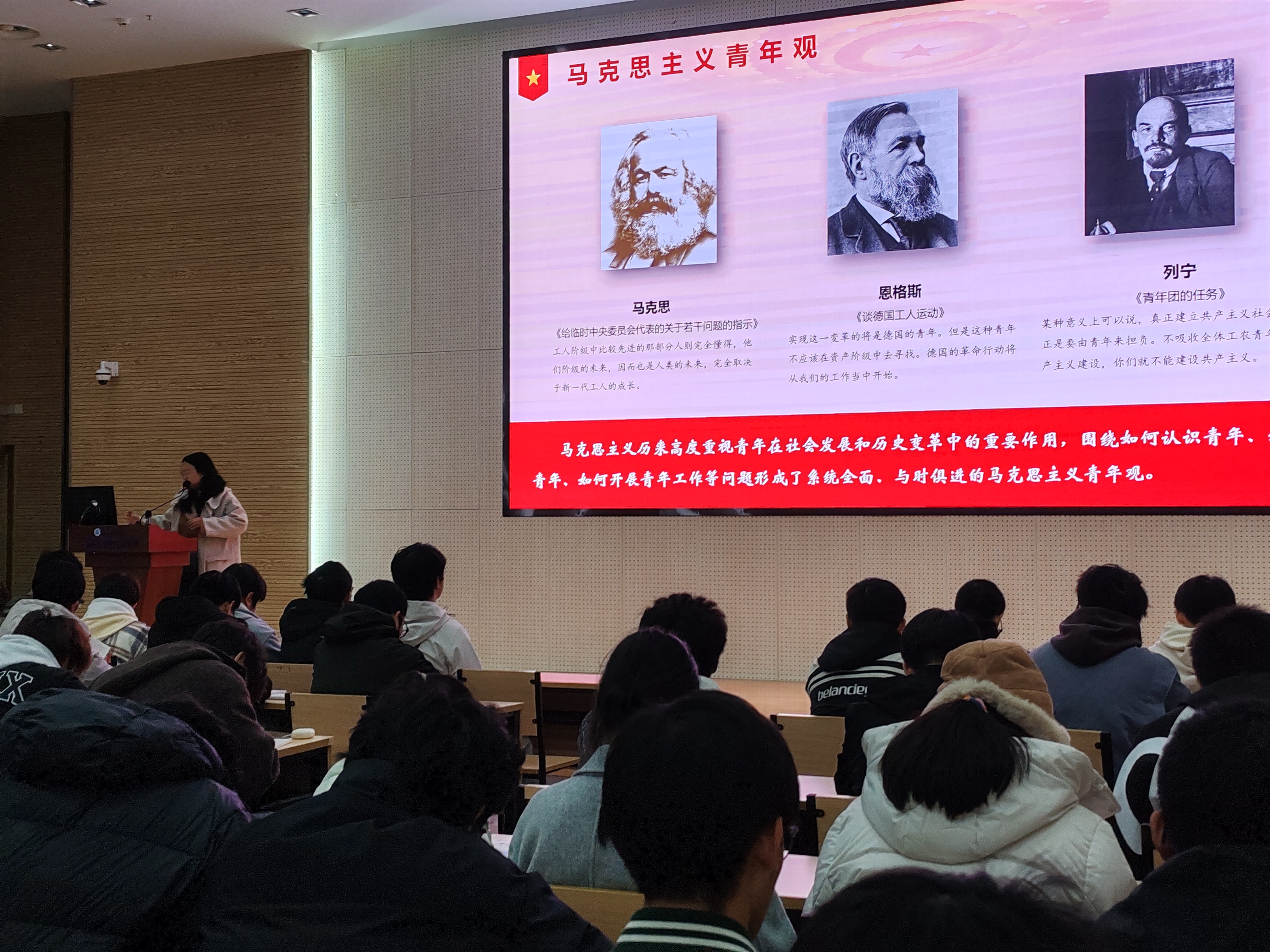 陈爽老师首先讲授了党领导中国青年运动史和总书记关于青年工作的重要思想引领新时代中国青年运动(2013-2025),带领同学们了解青年力量在民族复兴道路上所发挥的先锋作用,号召同学们传承红色基因,感悟青春誓言。
