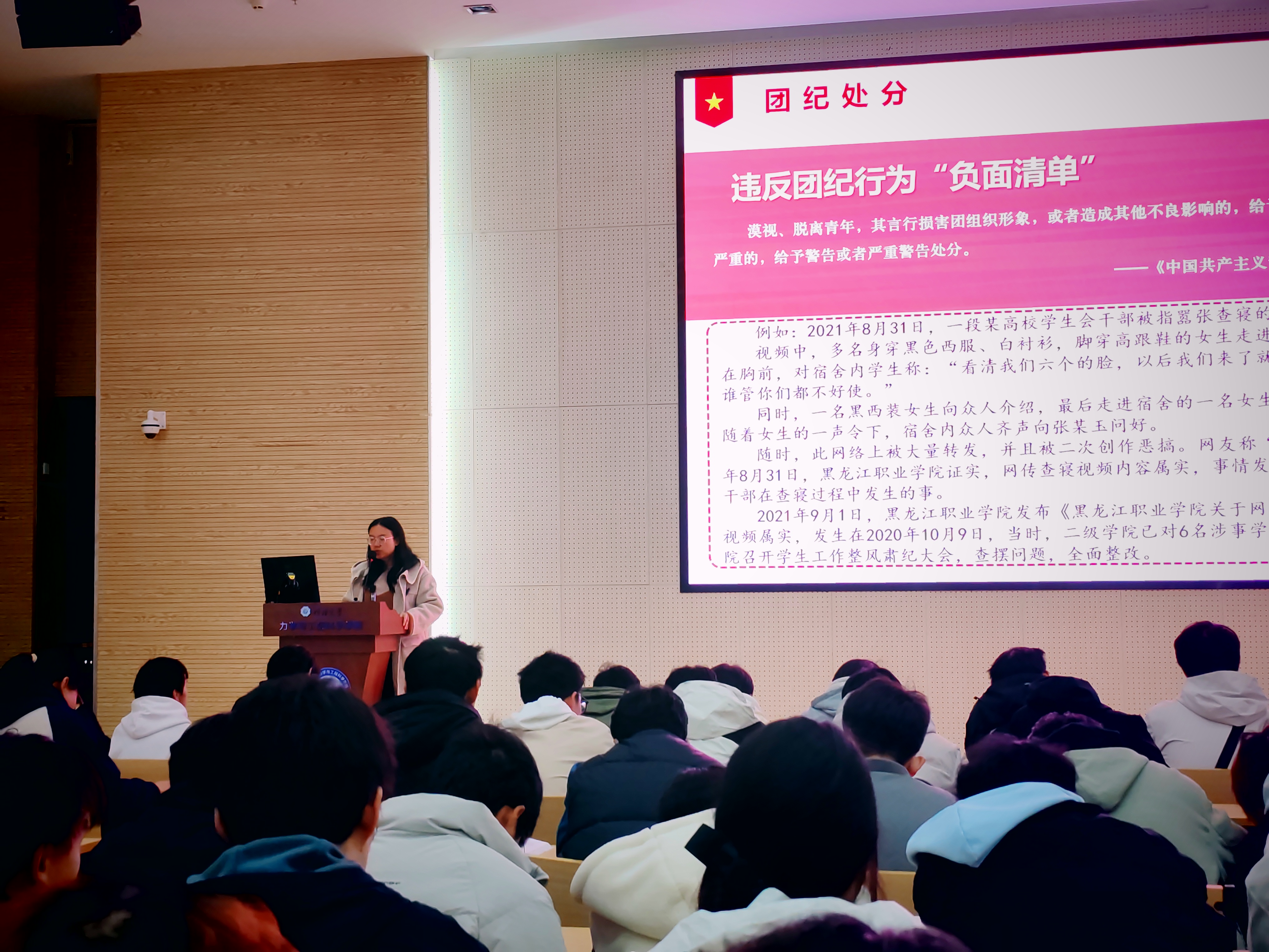 在团章与团纪学习部分,陈爽老师系统讲解了团员的义务权利和团的纪律,重点学习了《中共共产主义青年团纪律处分条例(试行)》,强调学习团纪有助于落实全面从严管团治团的要求,提高团员的政治修养,规范团员行为。